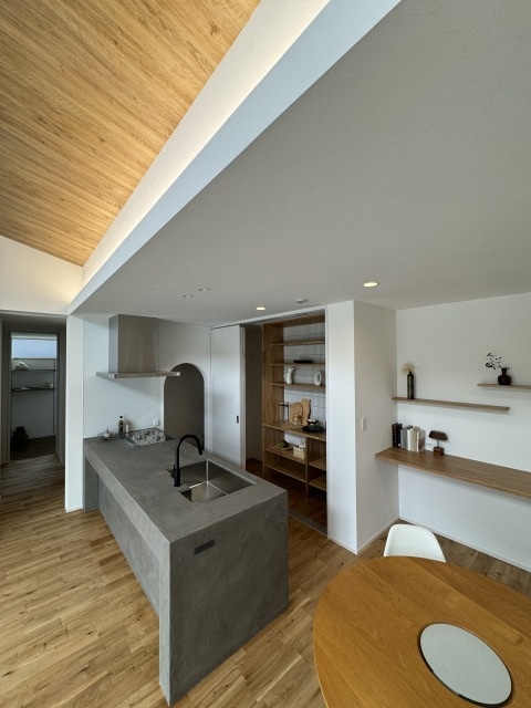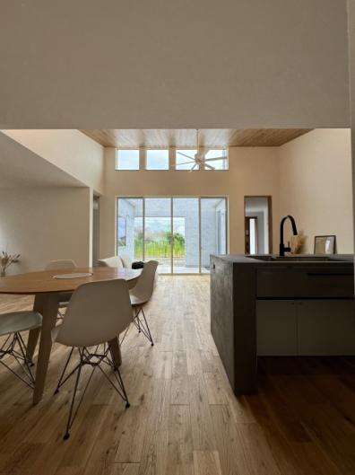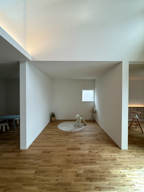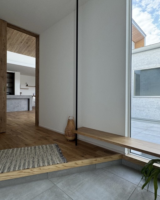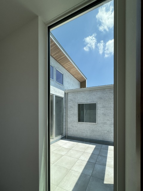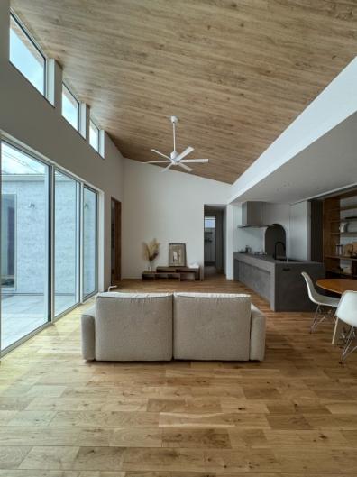 #24 中庭を囲むコの字型の平屋 陽ざしが差し込む開放感のある中庭と プライバシーが両立したコの字型の間取り。 外にある木製の扉を閉めるとさらに視線が気にならない 完全プライベートな中庭の完成。 ご家族もぺットものびのびと暮らす平屋のお家です。
