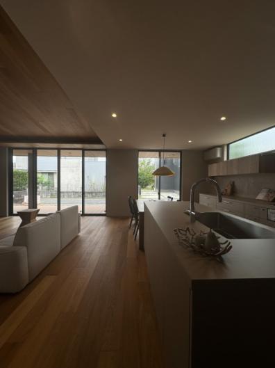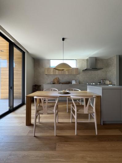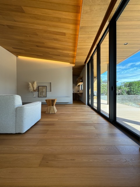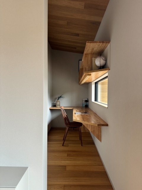 #26 深い軒と広々テラスで四季を感じる平屋~内と外が繋がる快適空間~ 窓越しに景色を望む書斎は、季節の変化を感じながら 仕事や趣味に没頭できる落ち着いた場所。 軒を深く伸ばした広々としたテラスは 外の時間をゆったり楽しめる心地よい空間。 自然の気配を身近に感じながら 快適さと機能性を兼ね備えた住まいです。